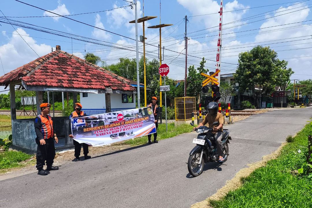 Karena keselamatan adalah aspek yang tidak mengenal batas waktu. Sebagai wujud nyata, KAI Daop 7 Madiun kembali menggelar kegiatan sosialisasi keselamatan secara masif di sejumlah perlintasan sebidang KA di wilayah Kabupaten Nganjuk hingga Madiun, Rabu (1/4).