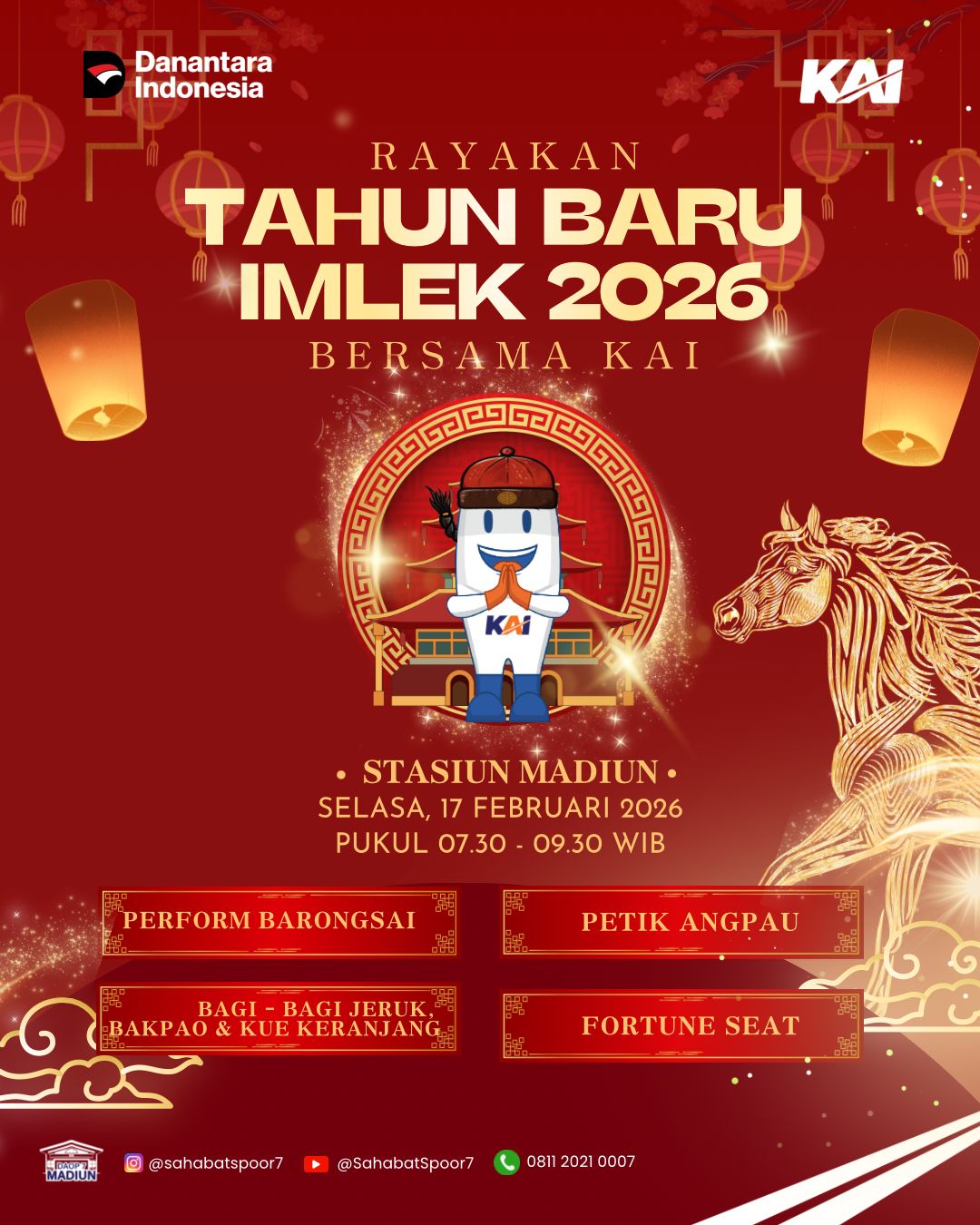 Manager Humas KAI Daop 7 Madiun, Tohari mengatakan kemeriahan Imlek akan memanjakan para pelanggan setia KAI, dengan gelaran rangkaian acara spesial tepat di Hari Raya Imlek pada pukul 07.30 WIB di Stasiun Madiun, Selasa 17 Februari 2026 besok.