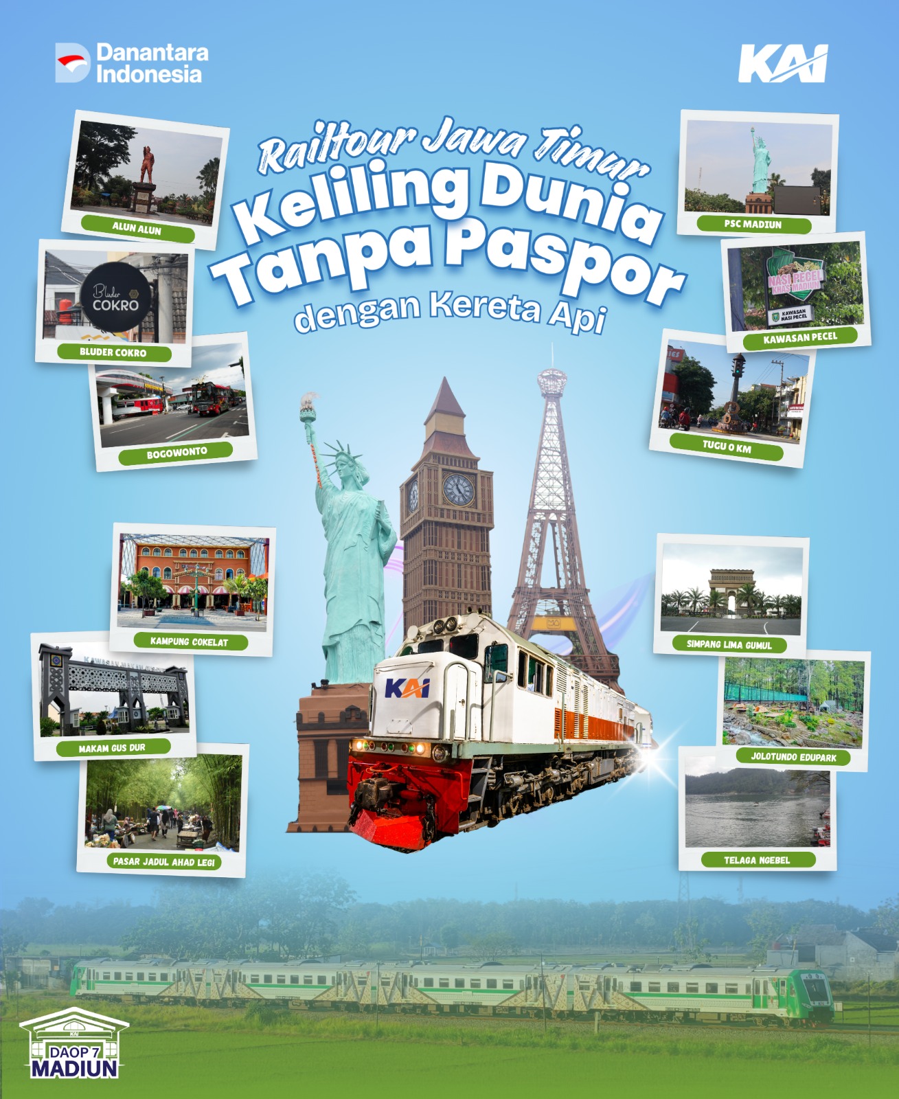 Untuk itulah, program Rail Tour Jawa Timur menawarkan berbagai paket wisata menarik yang meliputi destinasi di wilayah KAI Daop 7 Madiun dan sekitarnya, di antaranya: