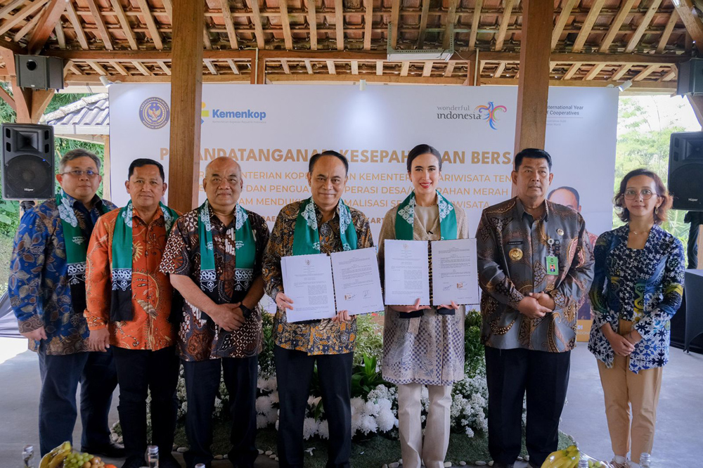 Kolaborasi tersebut diwujudkan melalui penandatanganan Nota Kesepahaman Bersama (MoU) antara Kementerian Pariwisata dan Kementerian Koperasi tentang pengembangan dan penguatan koperasi dalam mendukung optimalisasi sektor pariwisata di Desa Widosari, Yogyakarta, Jumat (9/5/2025). MoU tersebut ditandatangani oleh Menteri Pariwisata Widiyanti Putri Wardhana dengan Menteri Koperasi Budi Arie Setiadi.